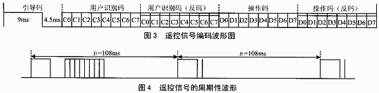 遥控器在按键按下后,周期性地发出同一种32位二进制码,周期约为108ms。一组码本身的持续时间随它包含的二进制“0”和“1”的个数不同而不同,大约在45~63ms之间,图4为发射波形图。